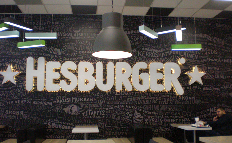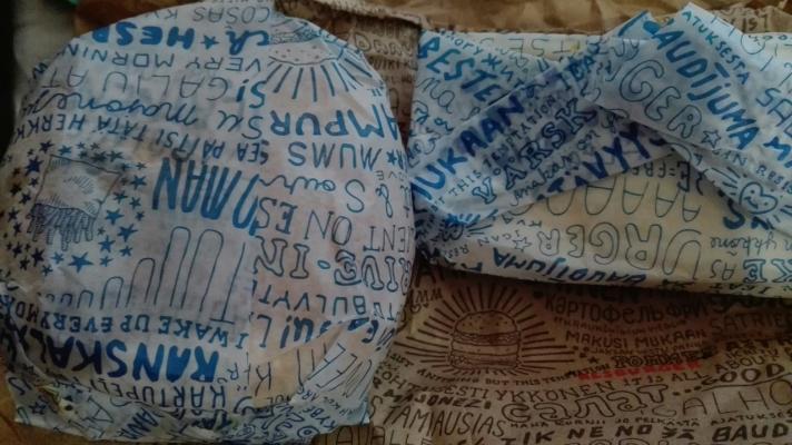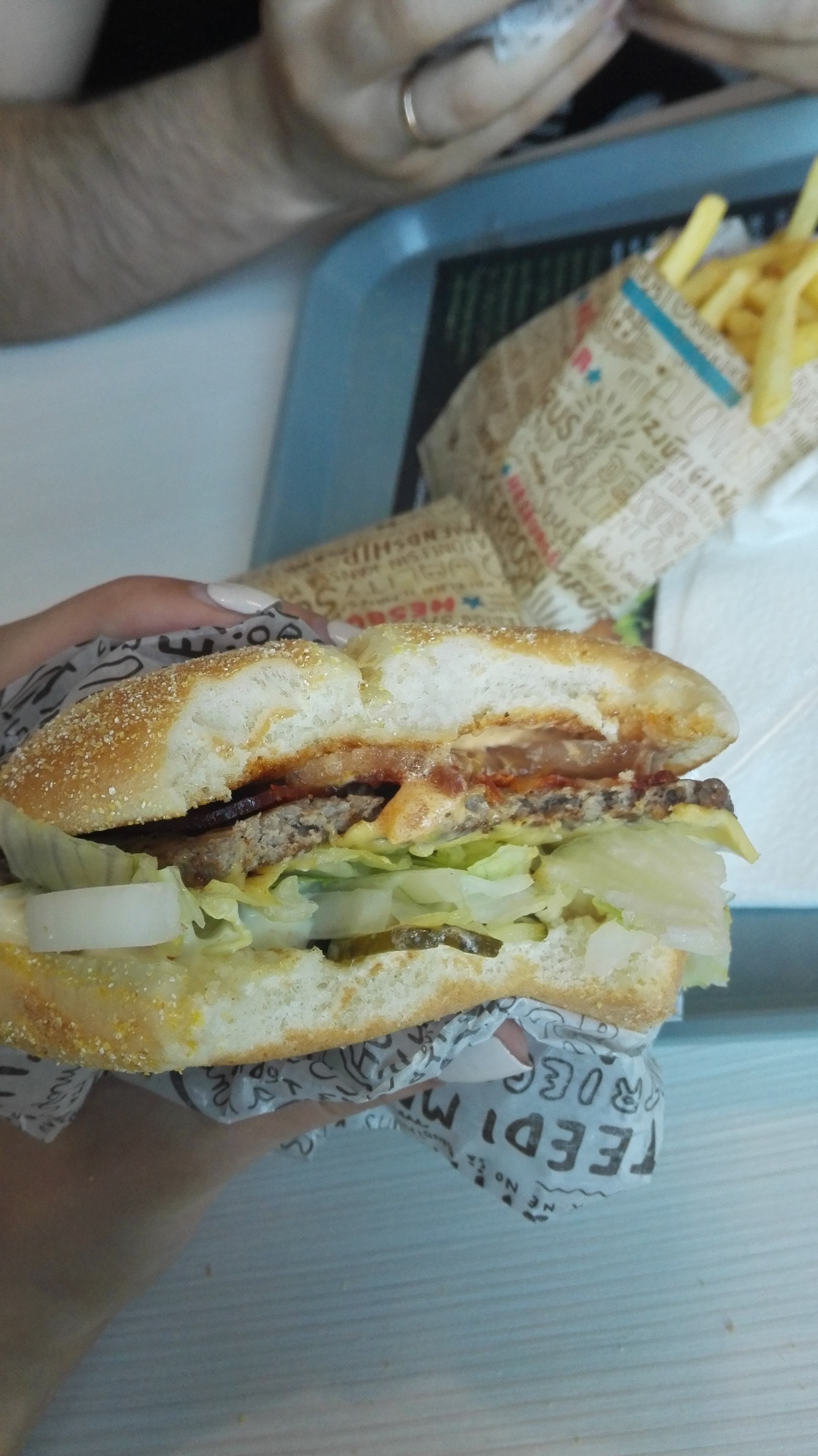 Большой бургер с двумя большими говяжьими котлетами, салатом, сыром Чеддер, помидорами, маринованными огурцами, с фирменными соусами Hesburger