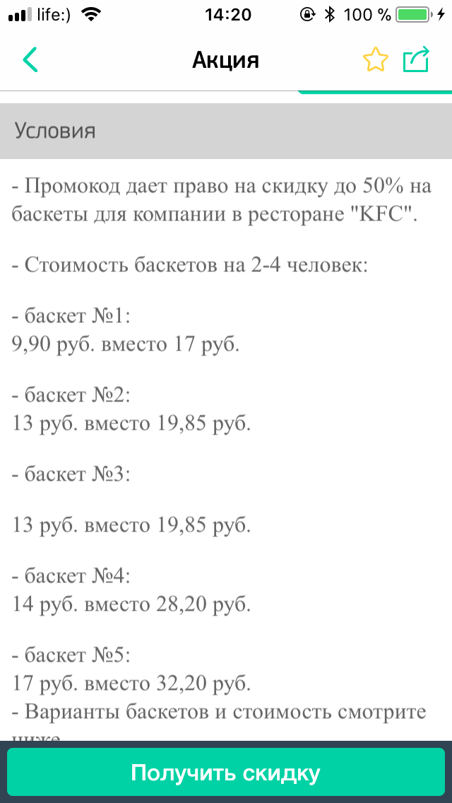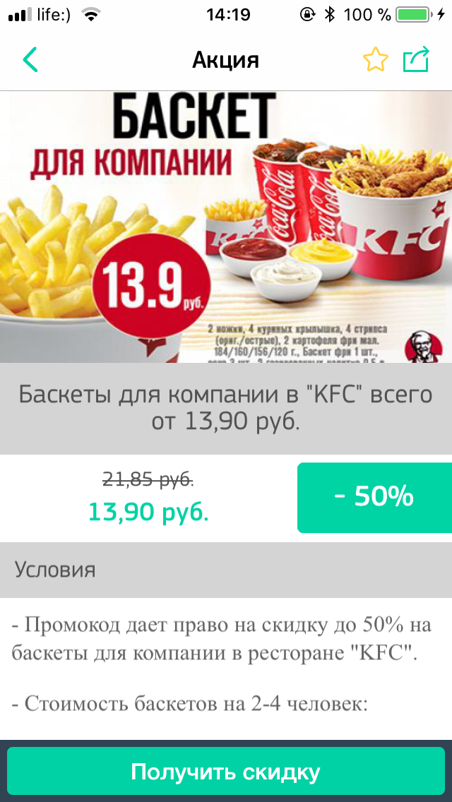 - Промокод дает право на скидку до 31% на 2 комбо на выбор в ресторанах "KFC"