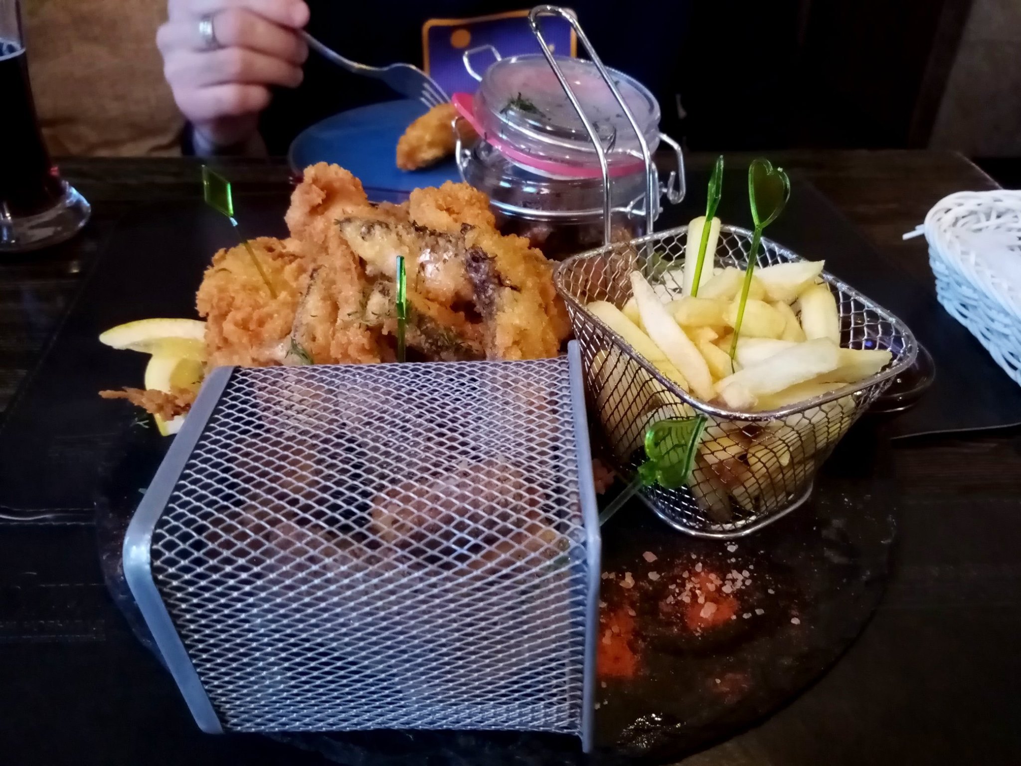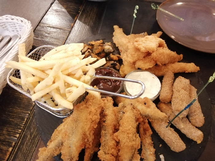 Заказали фиш энд чипс... Выглядит на 4 балла, вкс на 3+. До тройки опустила килька в панировке с головами, которой по весу около половины сета было, по вкусу - очень на любителя. И совсем не аппетитно... Пенное к сету - кислое (бивер). Вот мидий достаточно!)