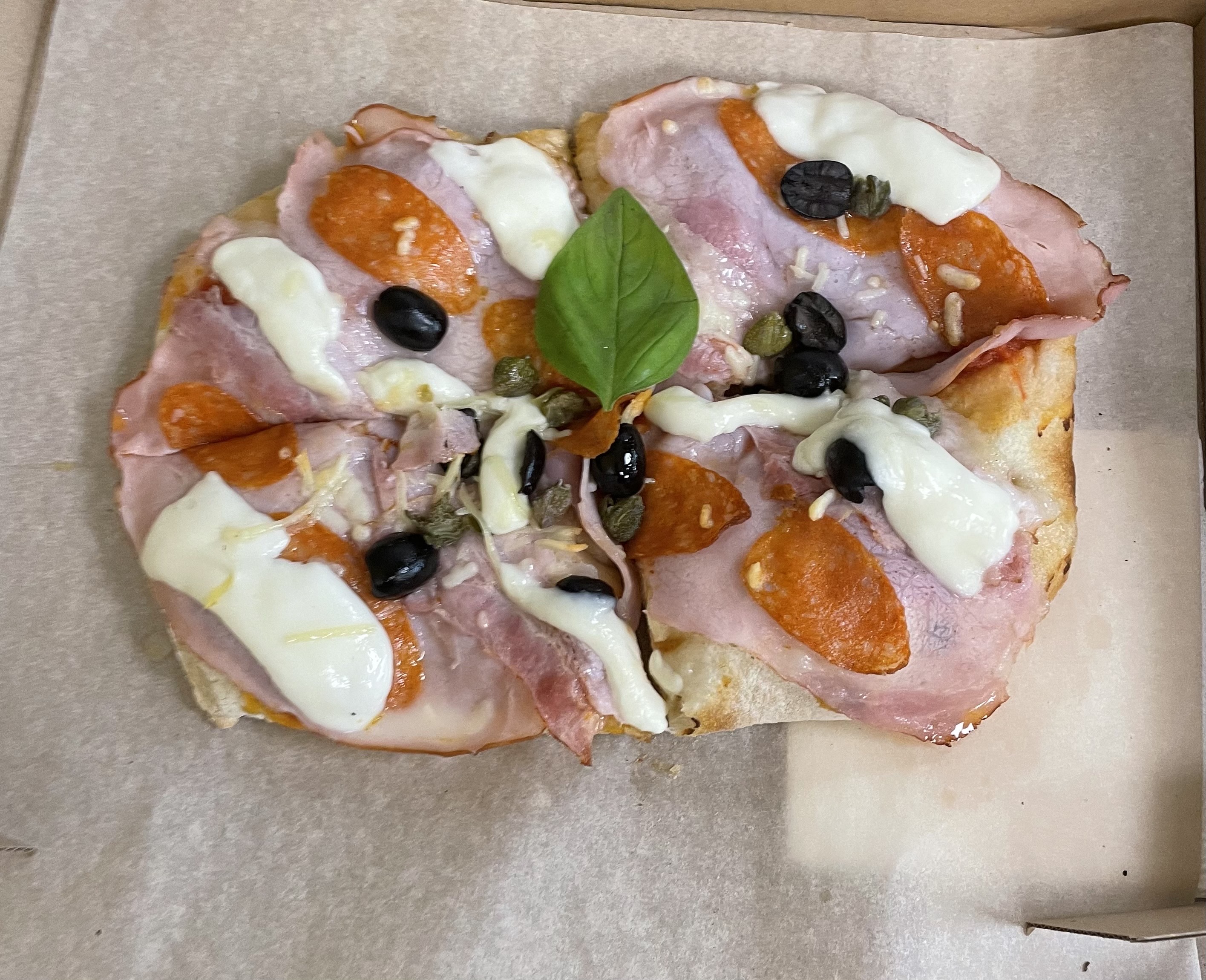 - пицца "Мясное ассорти" (25х20 см): ветчина, колбаса пепперони, бекон, каперсы, маслины, сыр моцарелла, сыр пармезан, масло оливковое, томатный соус, базилик свежий