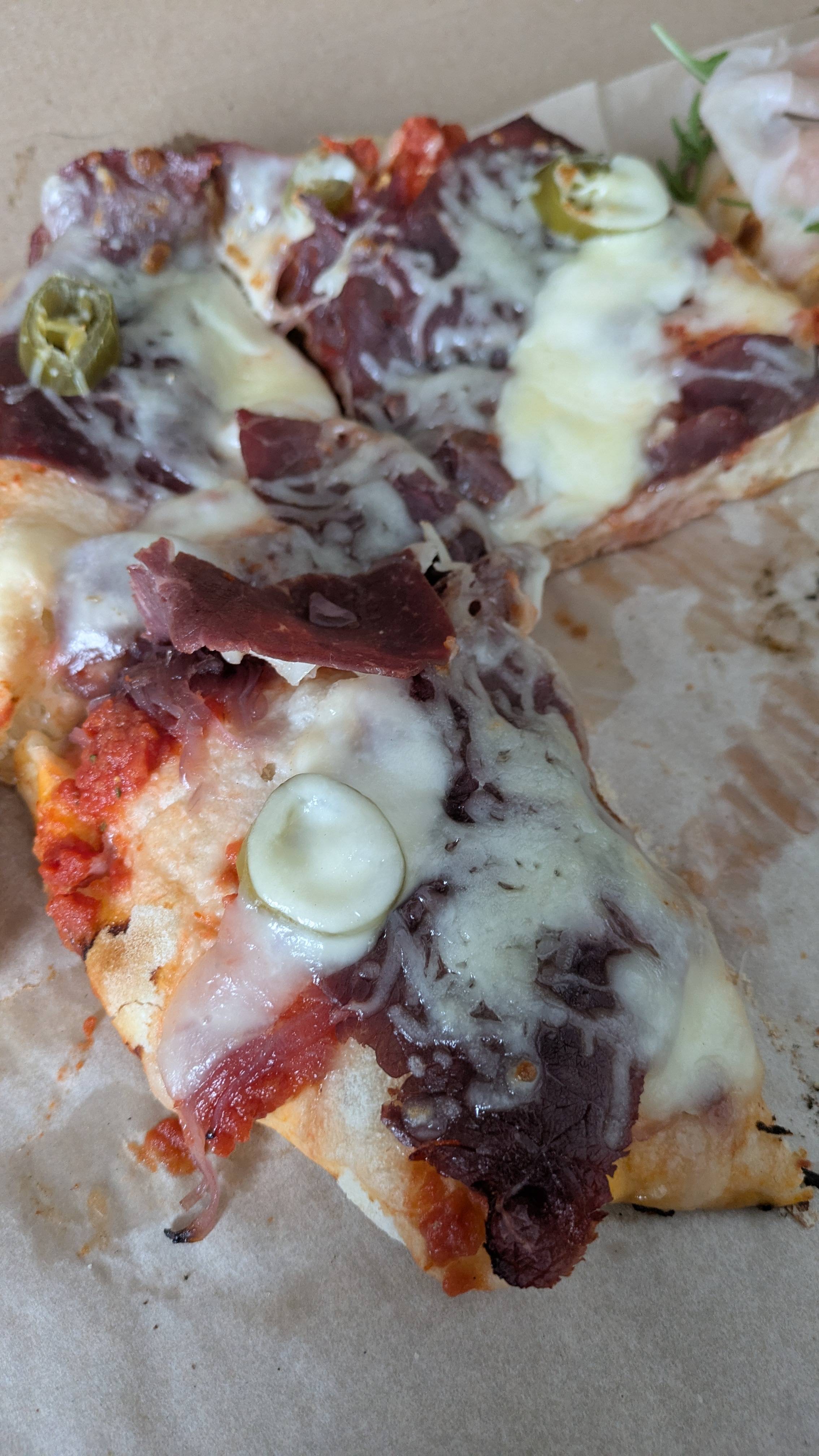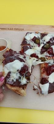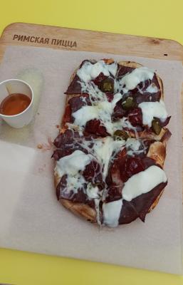 - пицца "Карпаччо из говядины" (25х20 см): говядина сырокопченая, перец халапеньо, лук красный карамелизированный, сыр моцарелла, пармезан, масло оливковое, базилик свежий и соус томатный