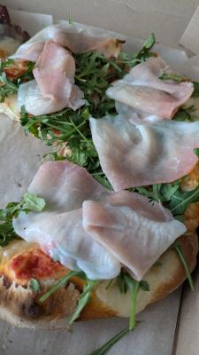 - пицца "Пармский окорок" (25х20 см): сырокопченая свинина, свежая руккола, томат черри, сыр моцарелла, масло оливковое и томатный соус