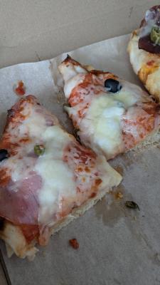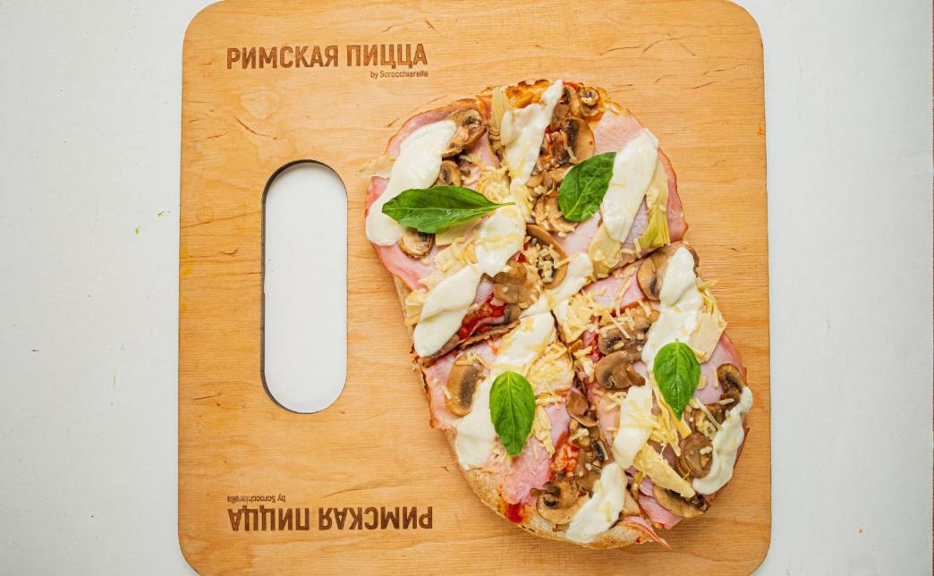 - пицца "Ветчина и грибы" (50х25 см): ветчина, сыр моцарелла, шампиньоны, сыр пармезан, масло оливковое, соус томатный, базилик свежий