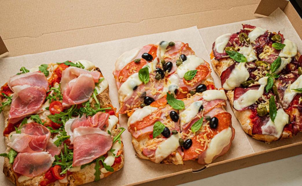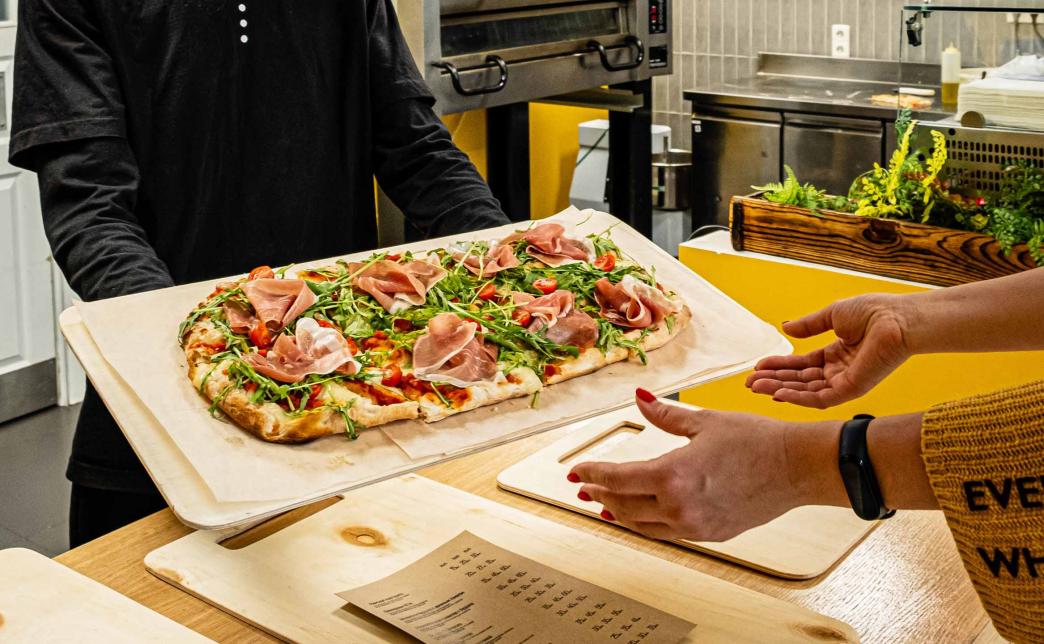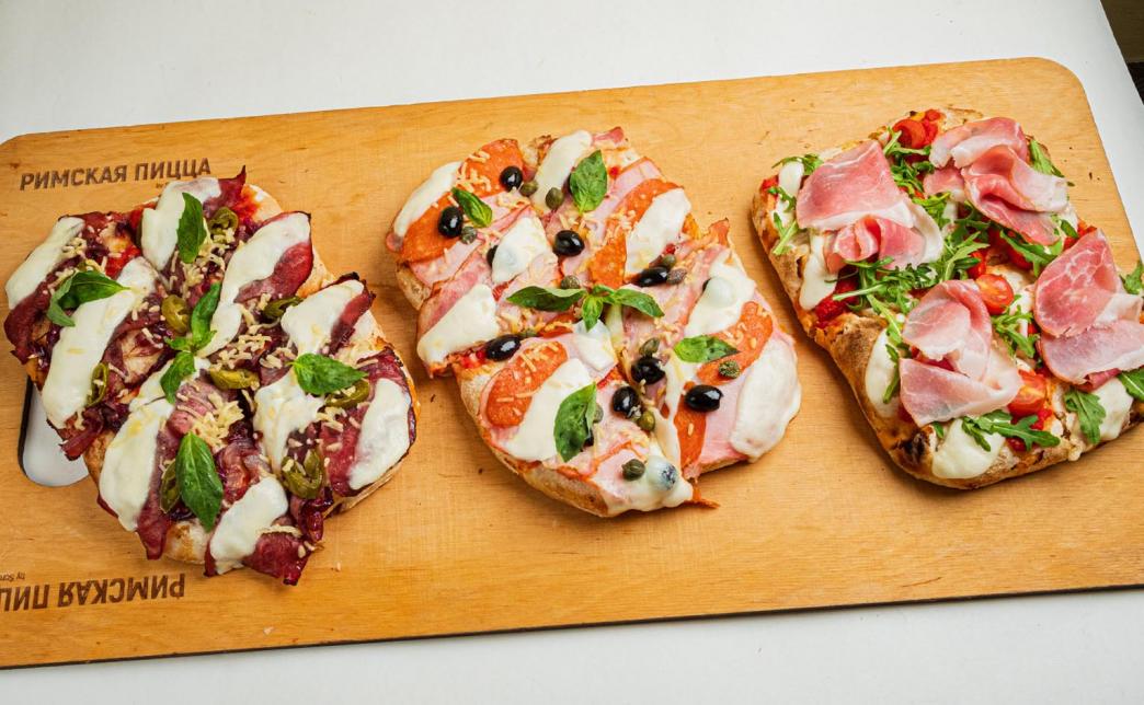 - пицца "Пармский окорок" (50х25 см): сырокопченая свинина, свежая руккола, томат черри, сыр моцарелла, масло оливковое и томатный соус