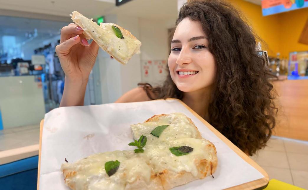 Состав: мортаделла, фисташки, сыр моцарелла, халвичный крем, сливочно-мускатный соус, томатный соус, масло оливковое, свежая мята
