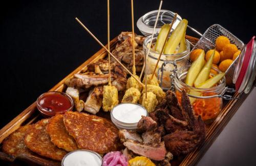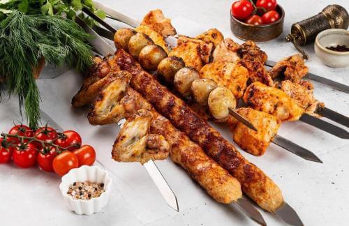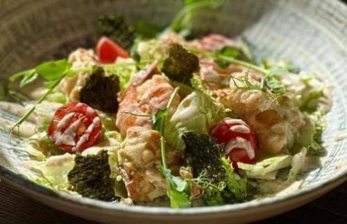 - салат "Астра" (говядина, ветчина, перец болгарский, огурец свежий, огурец маринованный, шампиньоны жареные, соус песто, сыр фета)