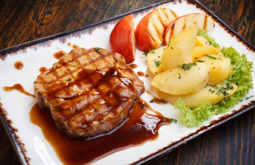 - медальоны из свинины в апельсиновом соусе + картофель по-деревенски