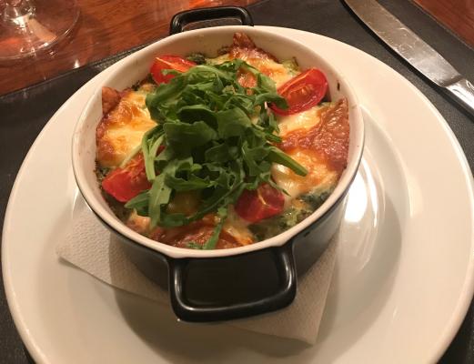 Рулет из цыплёнка и грудинки с запечёным картофелем и соусом из мяты и зелёного горошка