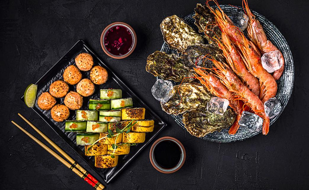 - окунь, сливочный сыр, вяленый томат, огурец, тобико, икра - 8 шт