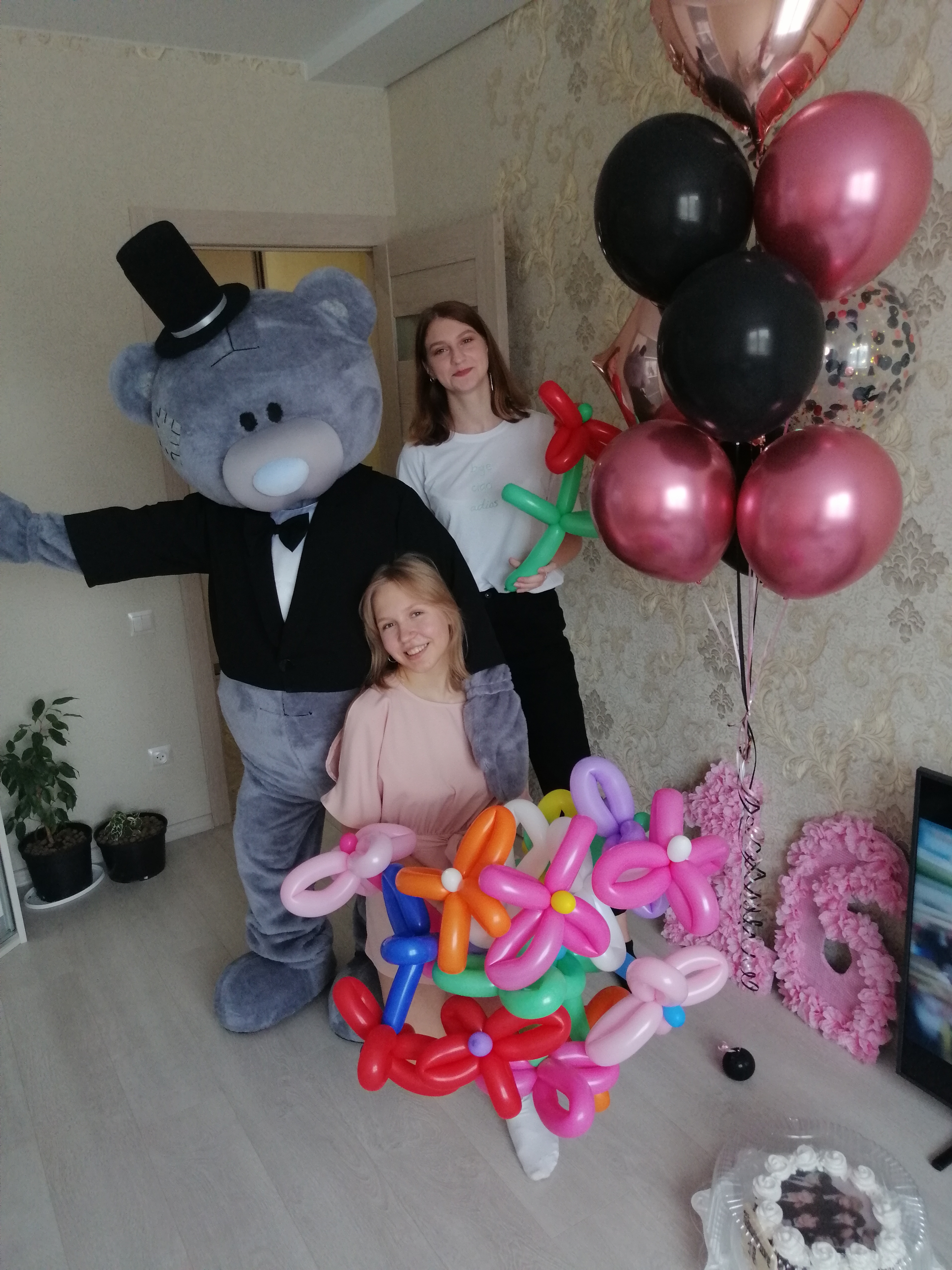 Заказывали мишку-джентльмена на 16 лет дочке. Экспресс-поздравление.  Не передаваемые впечатления дочки!!!  Необычно, красиво, незабываемо получилось такое  поздравление. Мишка молчит, но жесты и движения его все понятны, ему начинаешь подыгрывать, а он в ответ. Под музыку танцевал, позировал с девочками. Дети подростки  в огромном восторге. Огромный букет из 11 цветов, ярких, разноцветных. Сам мишка красивый, новенький такой!!!  Думала что 15 минут мало и мы не успеем  фото сделать, а на деле оказалось ооочень и очень придостаточно. Миллион фото, видио и на телефон и на камеру.  Спасибо огромное аниматору!!!!!!