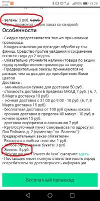 Приобрела промокод 25.02.(вторник),нужен был букет на субботу.Позвонила уточнила наличие цветов,сказали звонить в пятницу,хорошо.Связалась,приняли заказ, но сумма итого отличалась от того, что должна была быть .На вопрос почему условия акции поменялись и кустовые розы стали дороже? Мне ответили : Цены растут каждый день и сумма может меняться от привоза.Так спрашивается зачем нужен промокод и зачем указываете цены на цветы, если они постоянно меняются?