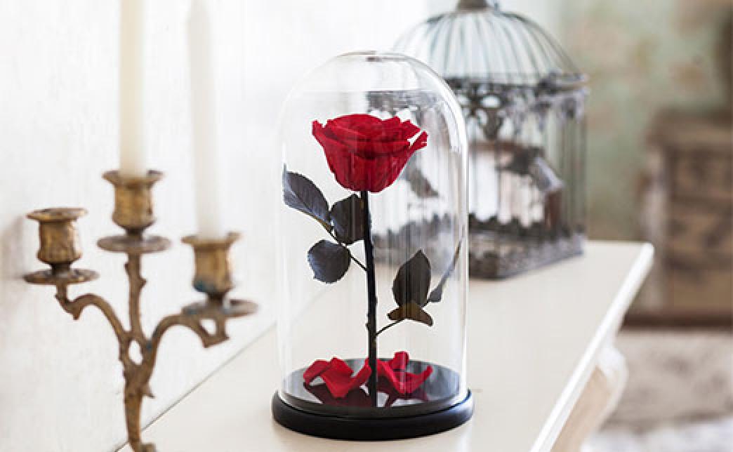 Все розы обрабатываются вручную: влага из них выпаривается и заменяется на состав на основе глицерина, благодаря чему они остаются такими красивыми и будто «застывшими во времени». Они являются изящным прототипом цветка из любимого для многих мультфильма «Красавица и чудовище».