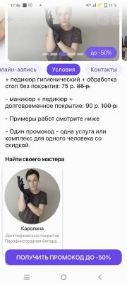 ( дома я их обработала перекисью водорода,до сих пор болят).А ещё меня очень удивил тот факт,что все материаллы( основа,лак) выскребались из почти пустых бутылочек,уже лежащих боком на столе.Отзыв написан по факту такой "работы".Вместо качества и комфорта,в итоге,получила отвратительный результат и испорченное настроение перед завтрашнем приглашением на день рождение.Проанализировав все события,я поняла,что меня просто вставили в маленькое временное окно,что бы на халяву с меня,как с нового клиента,содрать 100 руб по - быстрому.Никому не советую ,если не хотите плакать,такого мастера,как Каролина,со стажем 8 лет,которая так и не научилась не только делать маникюр и педикюр,но и уважать клиентов.