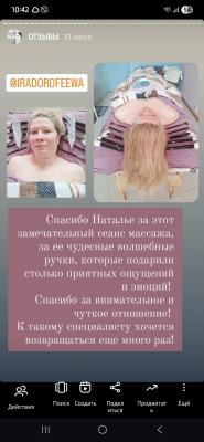 Добрый вечер! По горячим следам оставляю отзыв после авторского массажа всего тела и головы. Впервые мне делали настолько глубокий массаж, проработали все мышцы, все косточки. Массаж абсолютно всех частей тела за 1,5 часа, где 30 мин выделяется на голову и шею. Расслабление максимальное. Все движения плавные, без боли. Однозначно рекомендую. И вернусь снова на новые направления. Благодарю Наталью 🙏