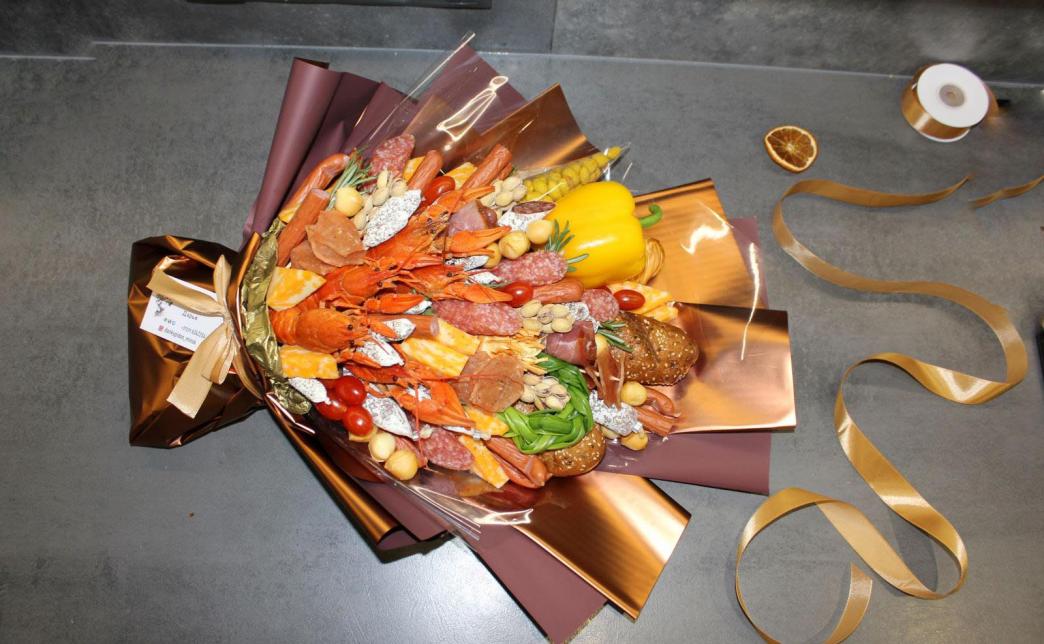 В наполнении : кабандосы , колбаса с/в , крендельки , сыр , косичка , сыр палочки , сыр кружочки , колбаски охотничьи , булочки , фисташки , черри , лимон , перец болгарский, зелень , декор. |