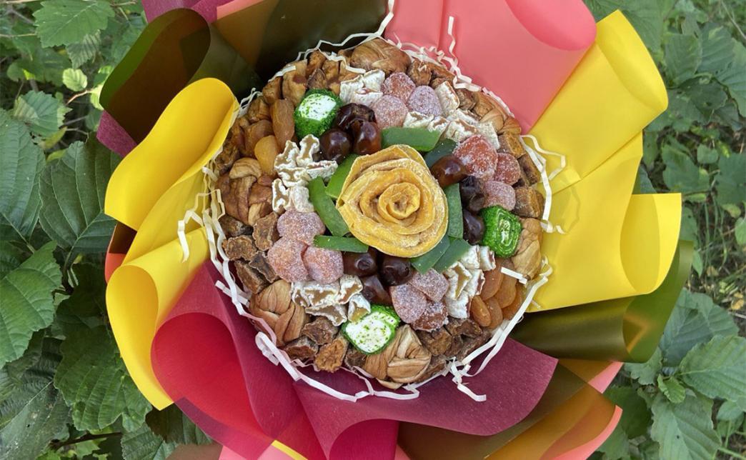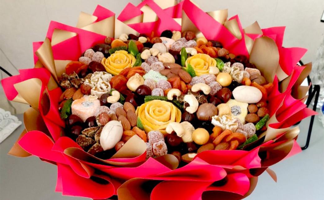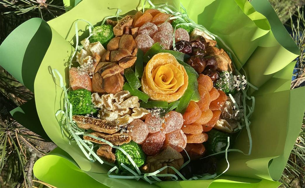 Состав: арахис в сахарной глазури, ассорти рахат-лукума, конфеты из орехов и сухофруктов, папайя, халва узбекская