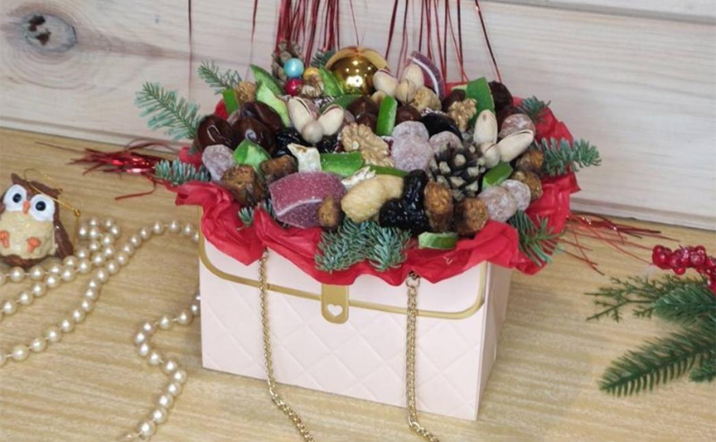 Состав: фисташка, кумкват, финик, чернослив, инжир, помело, бананы вяленые, рахат-лукум, мармелад