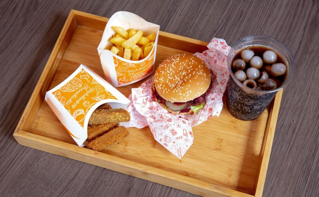 - vegan бургер (190 г): булочка, кетчуп, огурец  маринованный, котлета "Crazy Vegan", рис, масло растительное