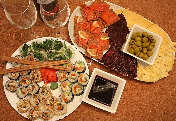 - "Фрай" ролл с лососем (лосось, сыр, авокадо, икра "Тобико", соус "Лос-Анджелес").