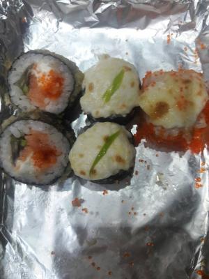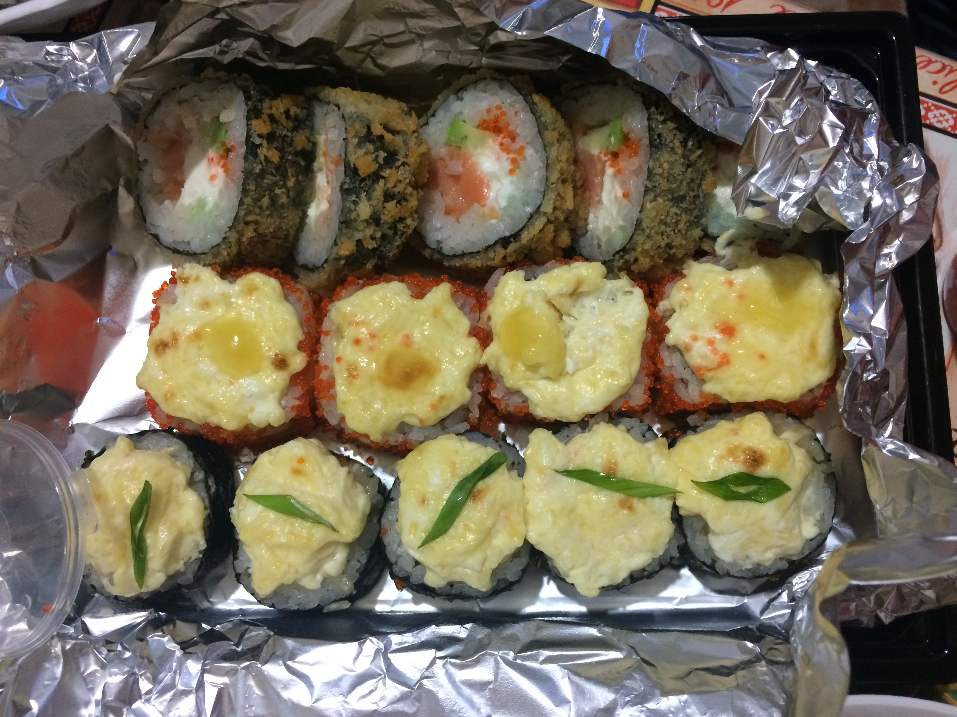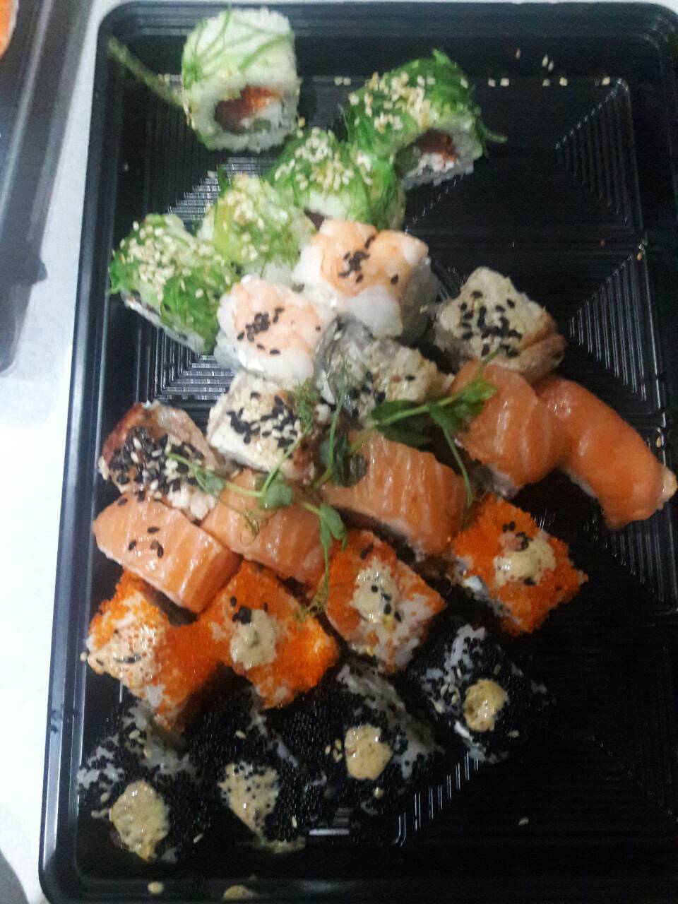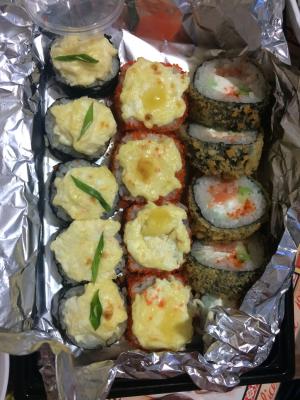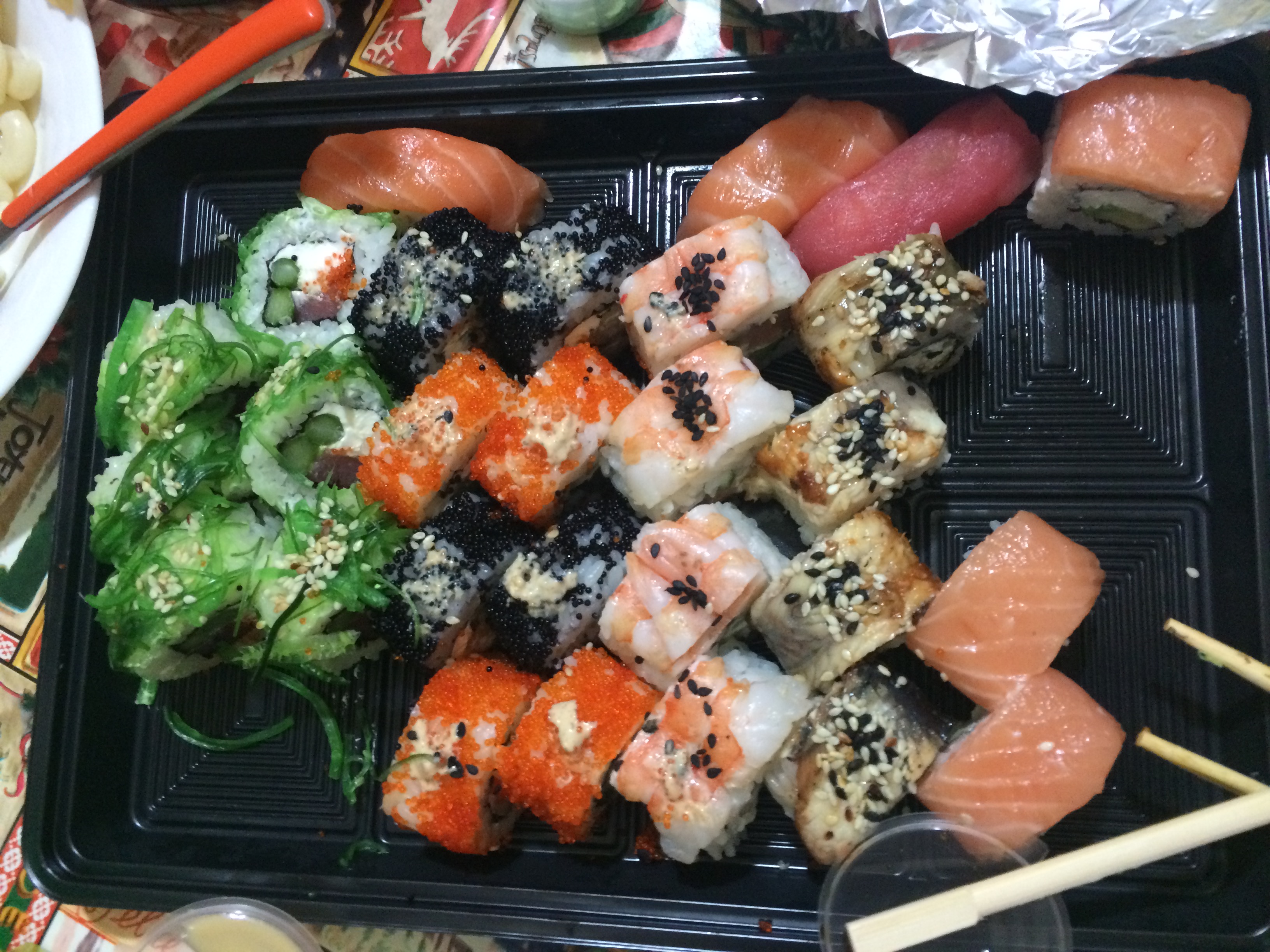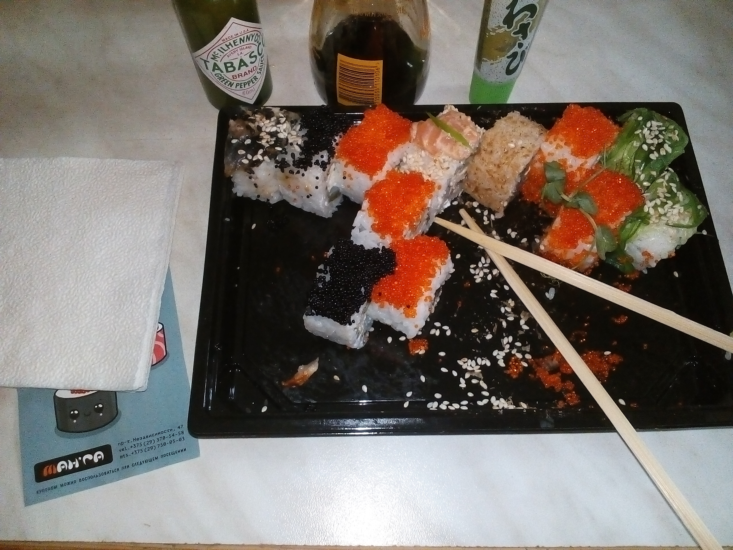 Недостатки: при доставке суши в коробке съехали и вид имели мятый. Теплые суши не были теплыми. Авокадо в суши был настолько неспелый, что горчил.  Палочки не прилагались