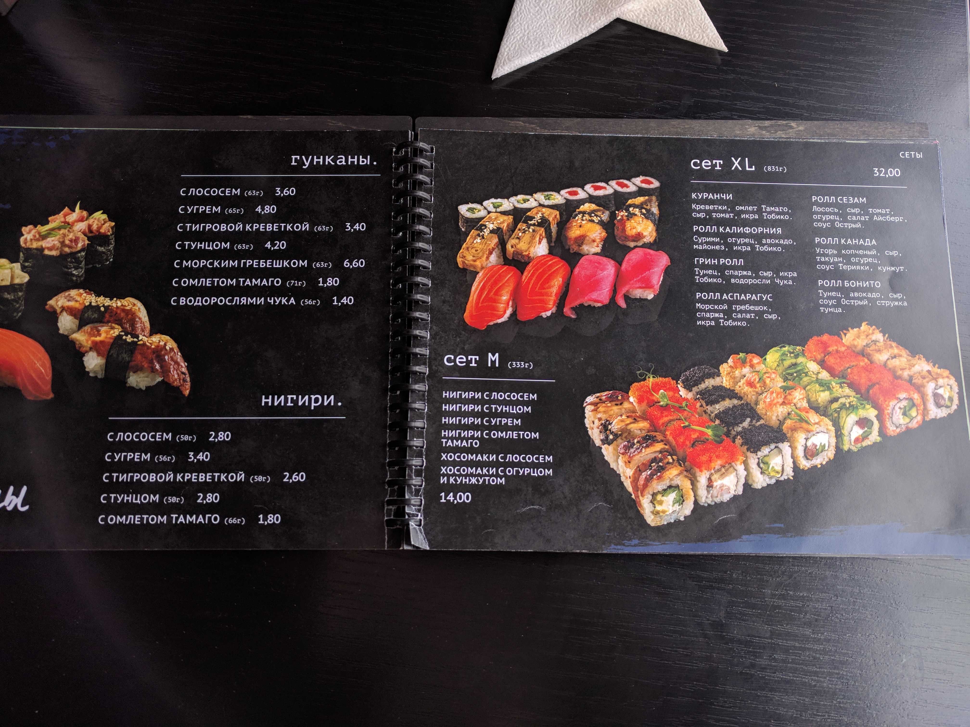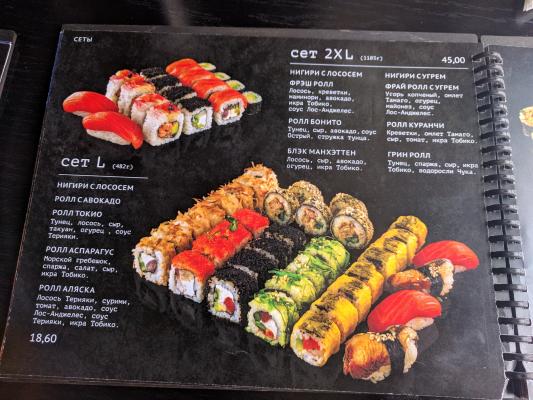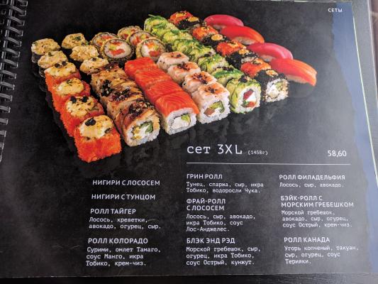 Здравствуйте. Мне очень понравилось в этом заведении. Была первый раз. Брали сет "XL" на двоих. Было даже замного. Хорошее место и приветливая девушка-официантка. Рекомендую в общем :)