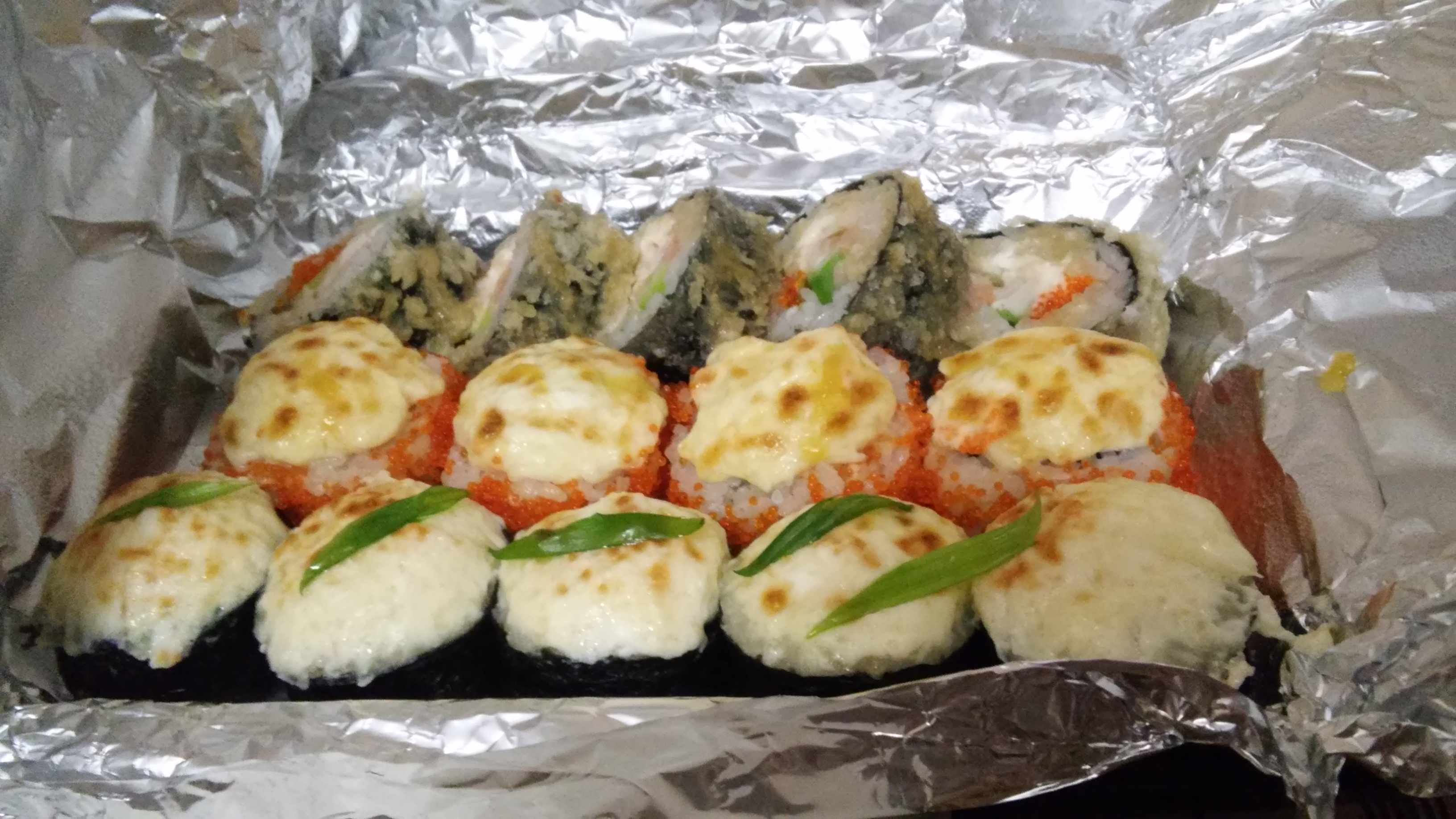 - "Фрай" ролл с лососем (лосось, сыр, авокадо, икра "Тобико", соус "Лос-Анджелес").