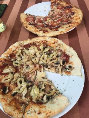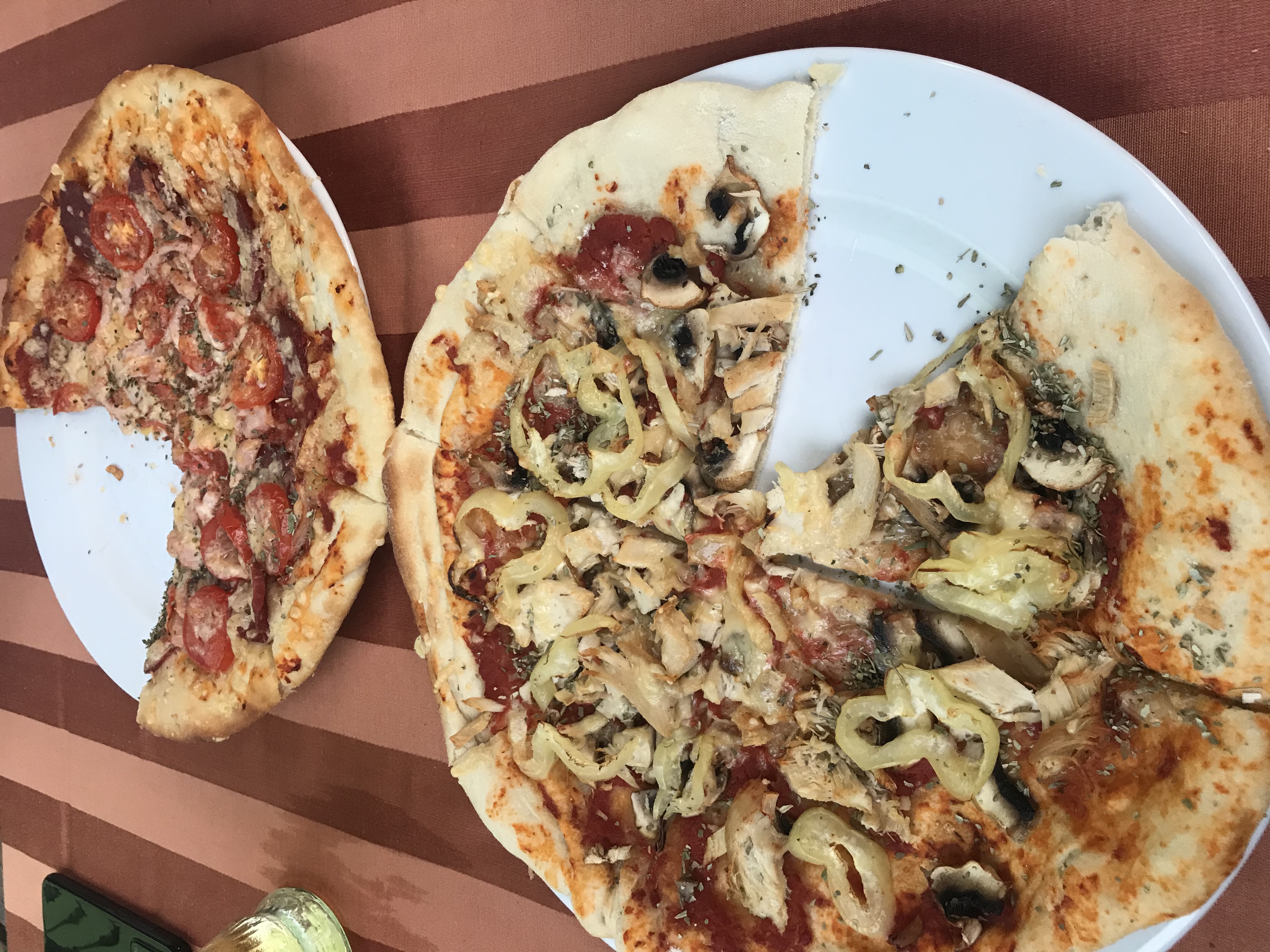 - пицца "4 сезона" (тесто, шампиньоны, куриное филе, сыр, болгарский перец)