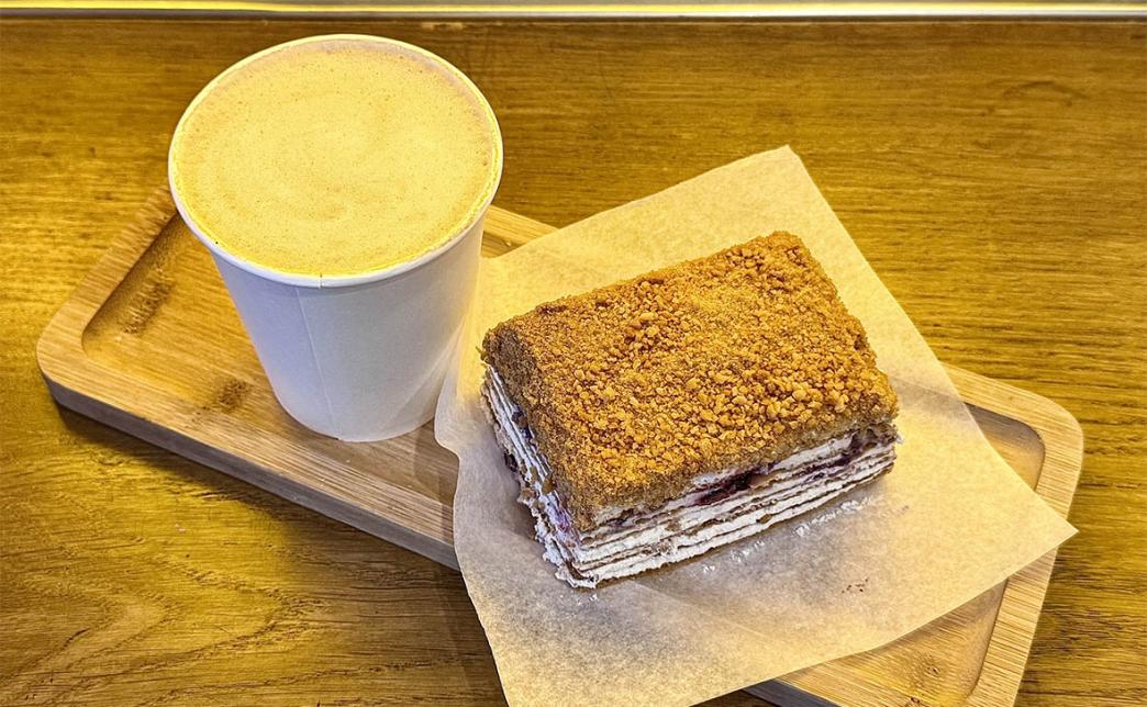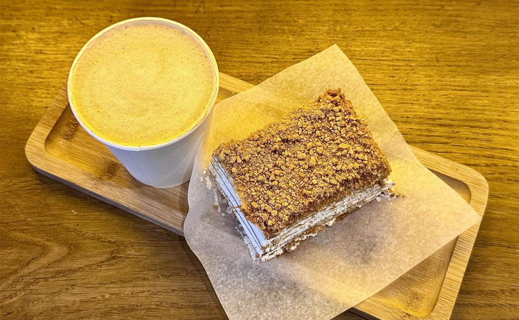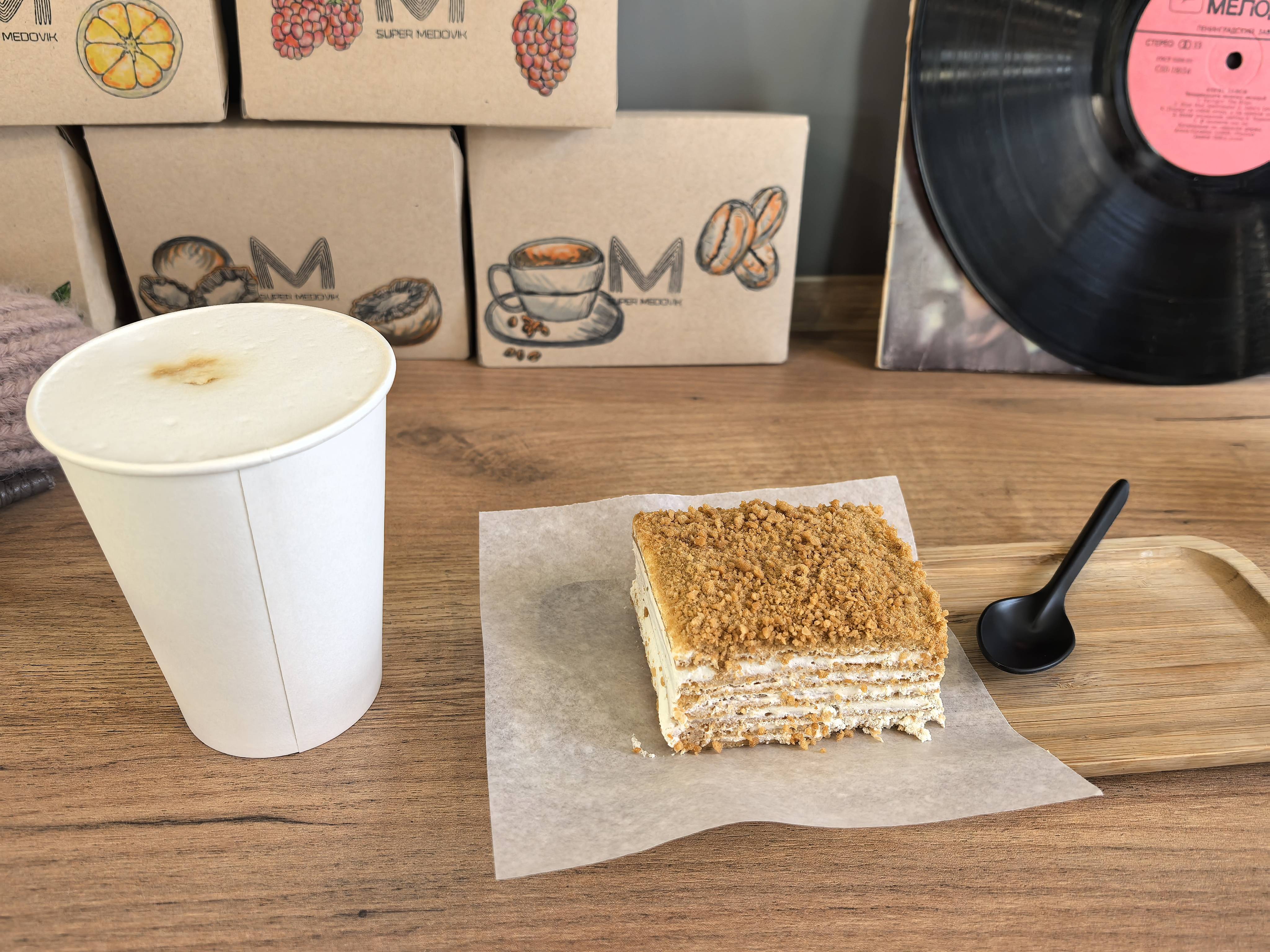 "Медовик (100 г) + капучино/латте (350 мл)"