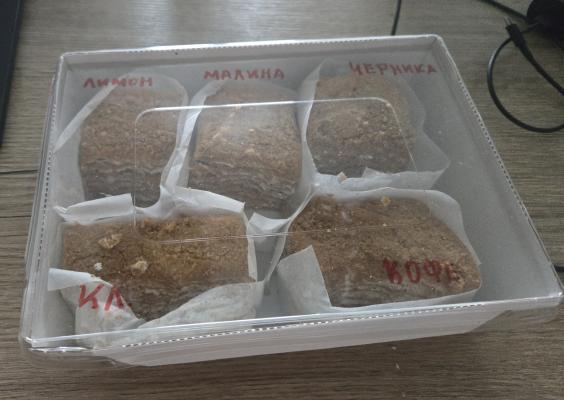 Состав: мука пшеничная высшего сорта, мед, сметана, сахар, яйцо, масло сливочное, уксус, сахар, ванилин