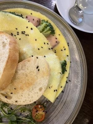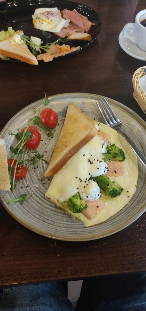 - омлет с лососем и брокколи: яйцо, сливки, брокколи, лосось, домашний сыр, томат черри, чиабатта (360 г)