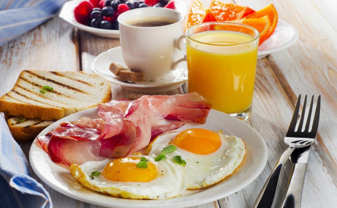 - яичница с беконом и чиабаттой: яйцо, бекон, чиабатта, овощной микс, чесночное масло, укроп (240 г)