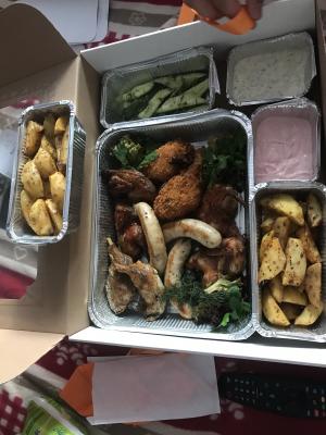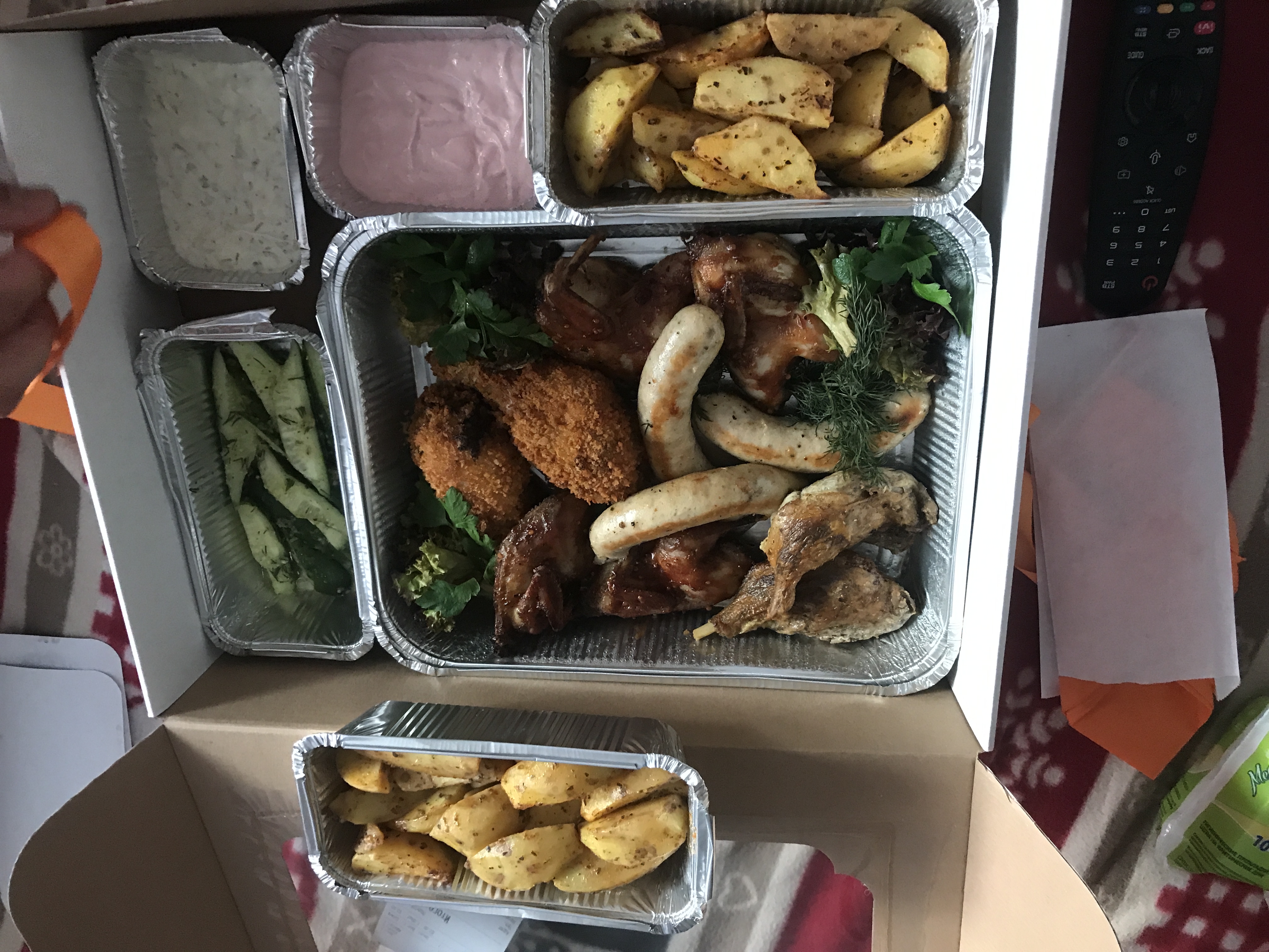 Состав сета: - шашлык из куриного филе - крылышки куриные острые - картофель фри - соус барбекю - лаваш