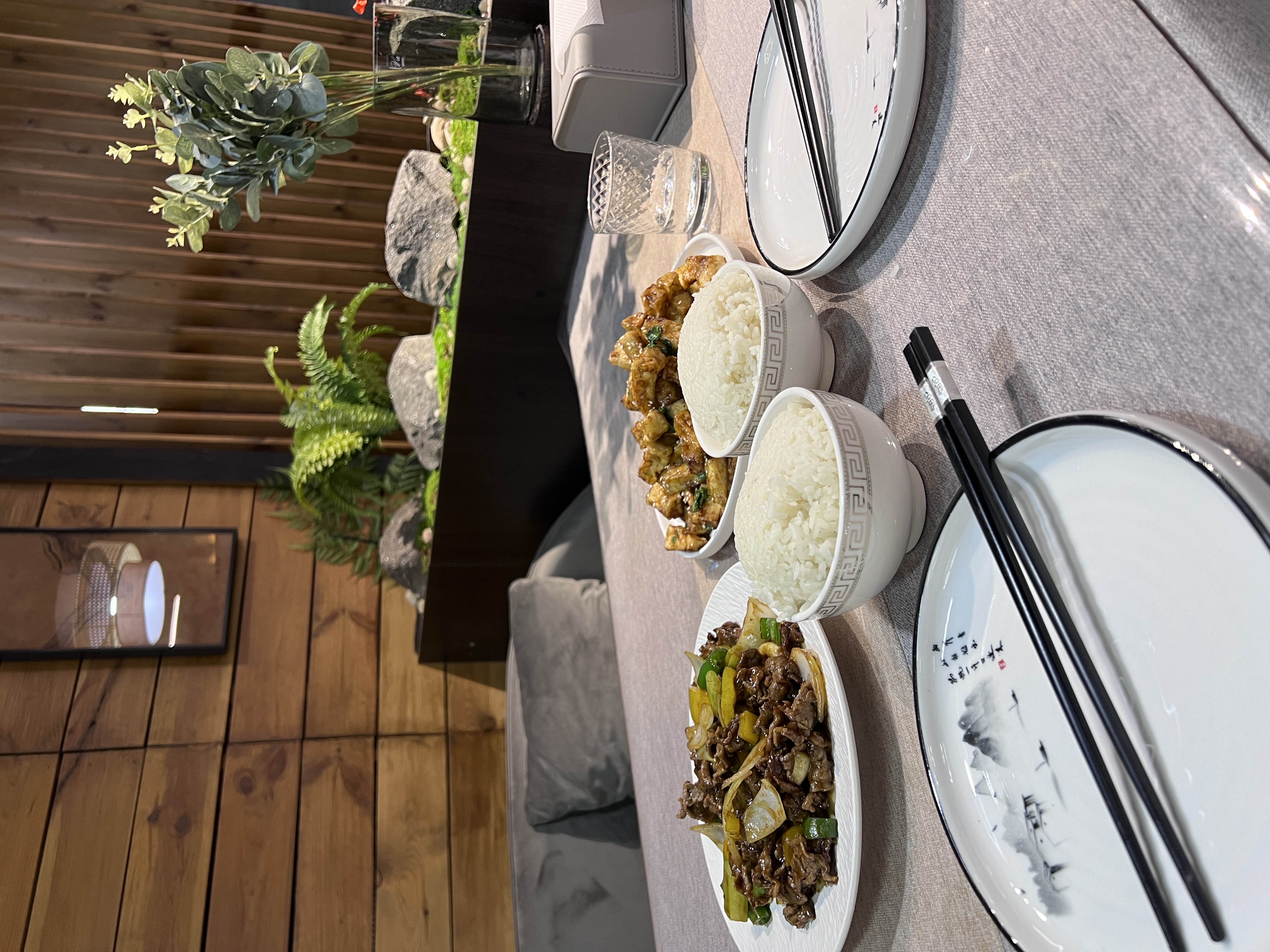 - жареная свинина "Юйсянжоусы" с рисом (500 г): мясо свинины, зеленый перец, морковь, грибы, рис