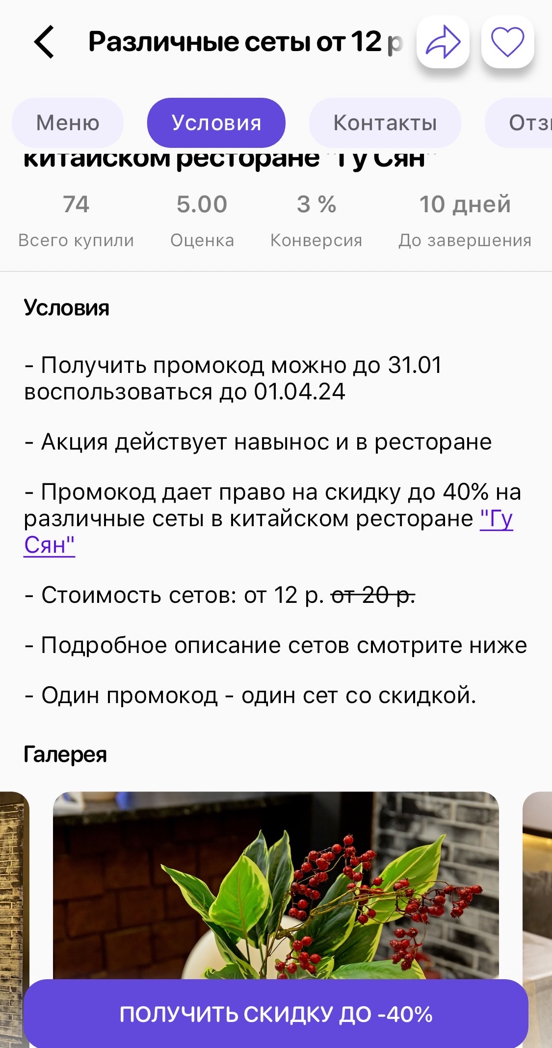 - Промокод дает право на скидку до 40% на различные сеты в китайском ресторане "Гу Сян"