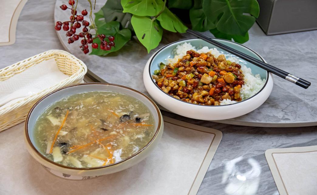 - кисло-острый суп (500 г): тофу, ветчина, грибы, яйцо