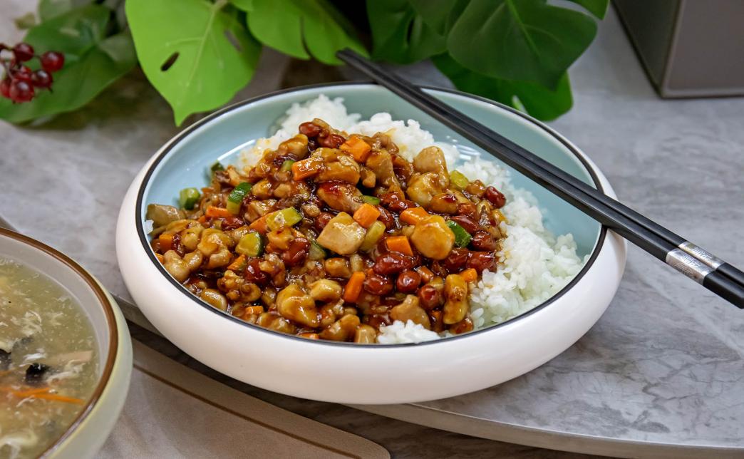 - курица "Гунбао" с рисом (500 г): курица, арахис, огурец, морковь, рис