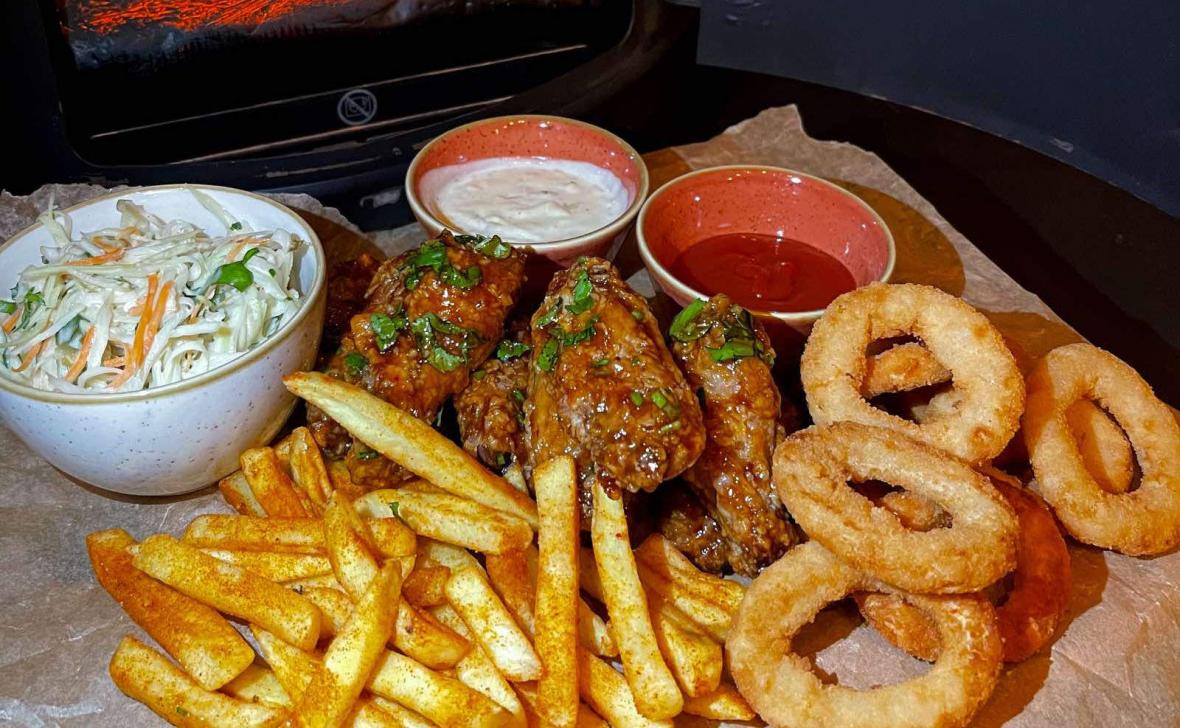 Состав: крылышки в соусе ким-чи, картофель фри, луковые кольца-фри, салат коул-слоу, соус тартар, соус кетчуп, два бокала пенного (светлое фильтрованное)