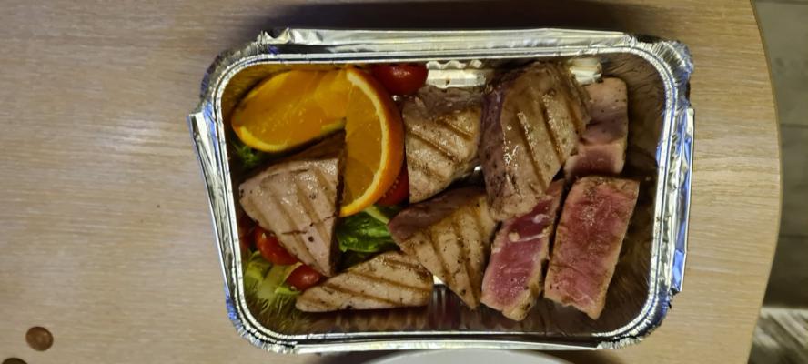 Состав: филе тунца (350 г), томаты, зелень, апельсин, соус (250 г)