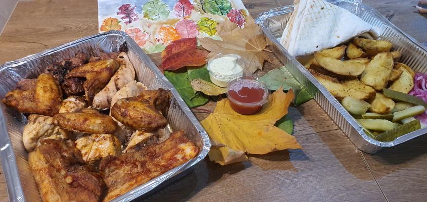 Состав: баварская колбаска-гриль (курица + свинина) (250 г), куриное филе на гриле (200 г), крылышки барбекю (250 г), картофель по-деревенски (300 г), маринованный лук (150 г), маринованный огурчик (100 г), соус чесночный (50 г), кетчуп (50 г), лаваш (150 г)