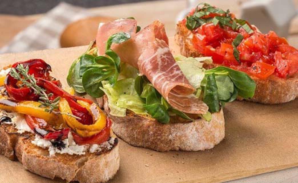 - сет из брускетт (четыре хрустящих ломтика хлеба с ростбифом из говядины и сыром фета, с креветкой и авокадо, с томатом и сыром моцарелла, с грушей и сыром дор блю)
