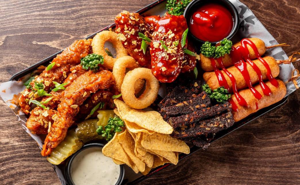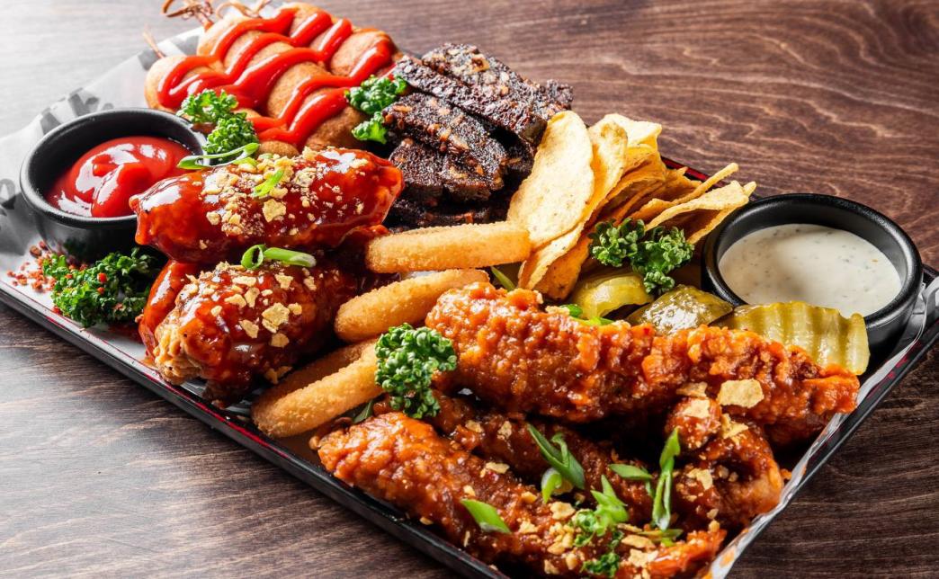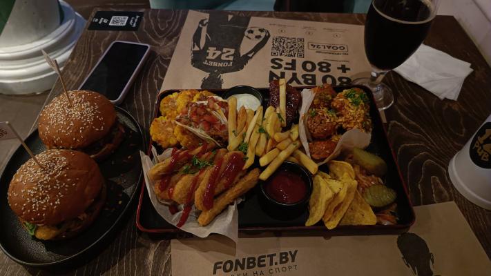 - сет "К пенному" (крылья + стрипсы + луковые кольца + корн-доги + гренки + маринованные огурцы + начос + соусы томатный и тар-тар, 800 г): 29 р. 49 р.