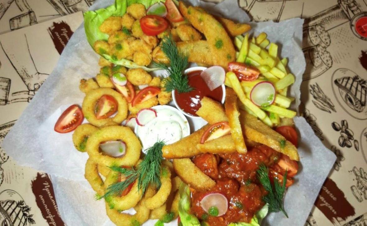- куриный попкорн, луковые кольца, картофель фри, сухарики белые, черри, кетчуп, соус чесночный, салат, зелень.
