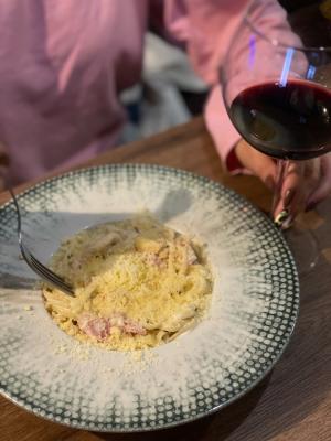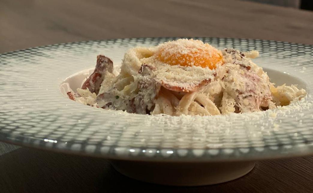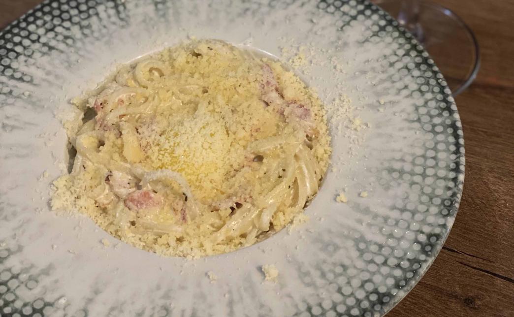 Состав: паста, сливки, бекон, пармезан, яйцо, виноградный напиток