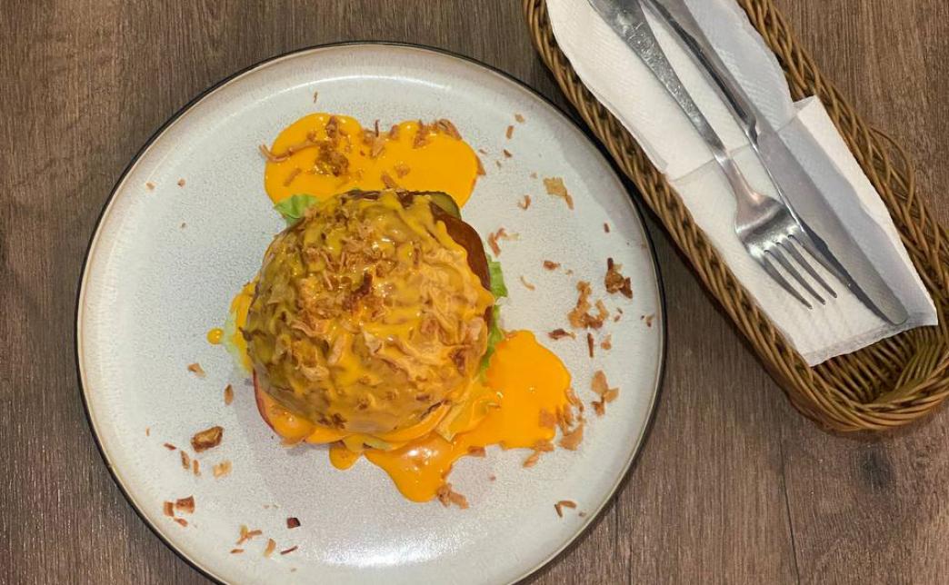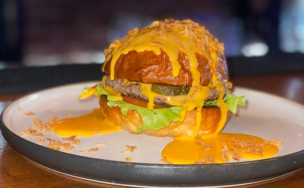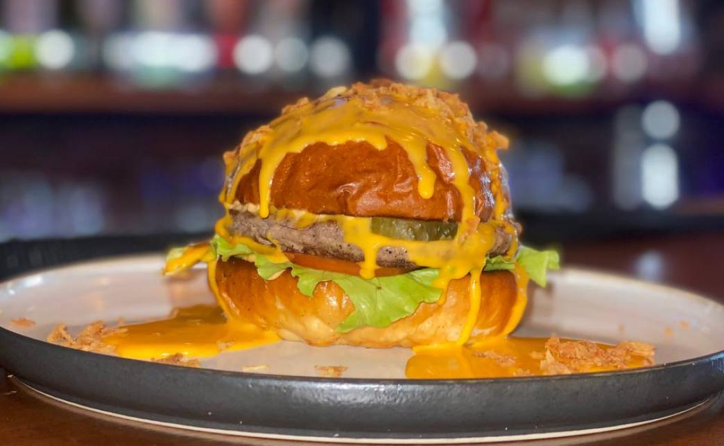 Состав: говядина, салат, двойной бекон, томат, огурец маринованный, жидкий сыр, чеддер, кристал лук, фирменный соус, картофель фри