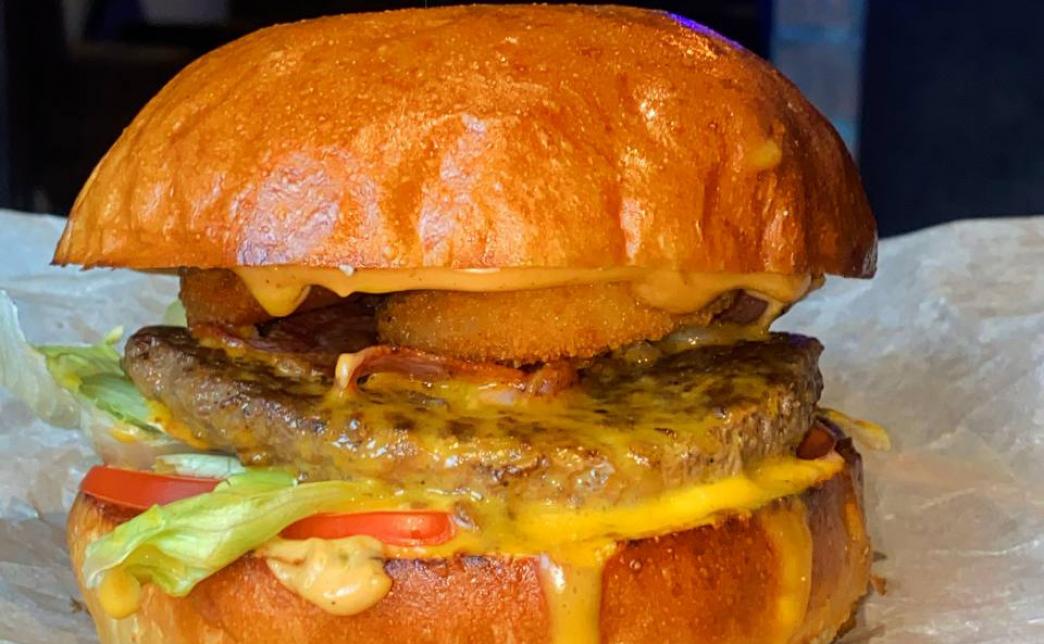 Состав: говядина, салат, двойной бекон, томат, огурец маринованный, жидкий сыр, чеддер, кристал лук, фирменный соус, картофель фри, пенный напиток