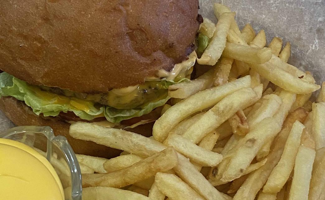 Состав: говядина, салат, томат, огурец маринованный, чеддер, фирменный соус, картофель фри