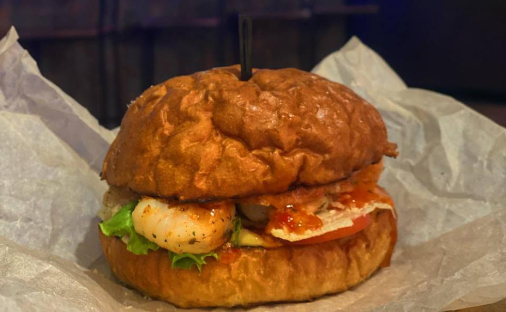 Состав: креветки, бекон, салат, томат, пармезан, фирменный соус, картофель фри, пенный напиток