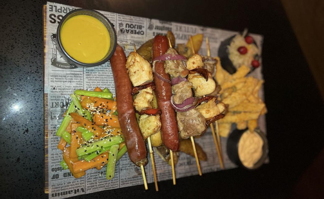 - мини-корндог: слоеное тесто, охотничьи колбаски, кетчуп, горчичный соус