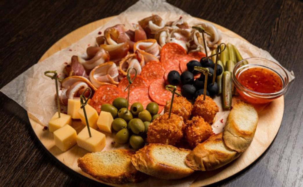Состав: прошутто, чоризо, сало, ветчина, бекон, сыр маасдам, жареный сыр в хрустящей панировке, корнишоны, багет