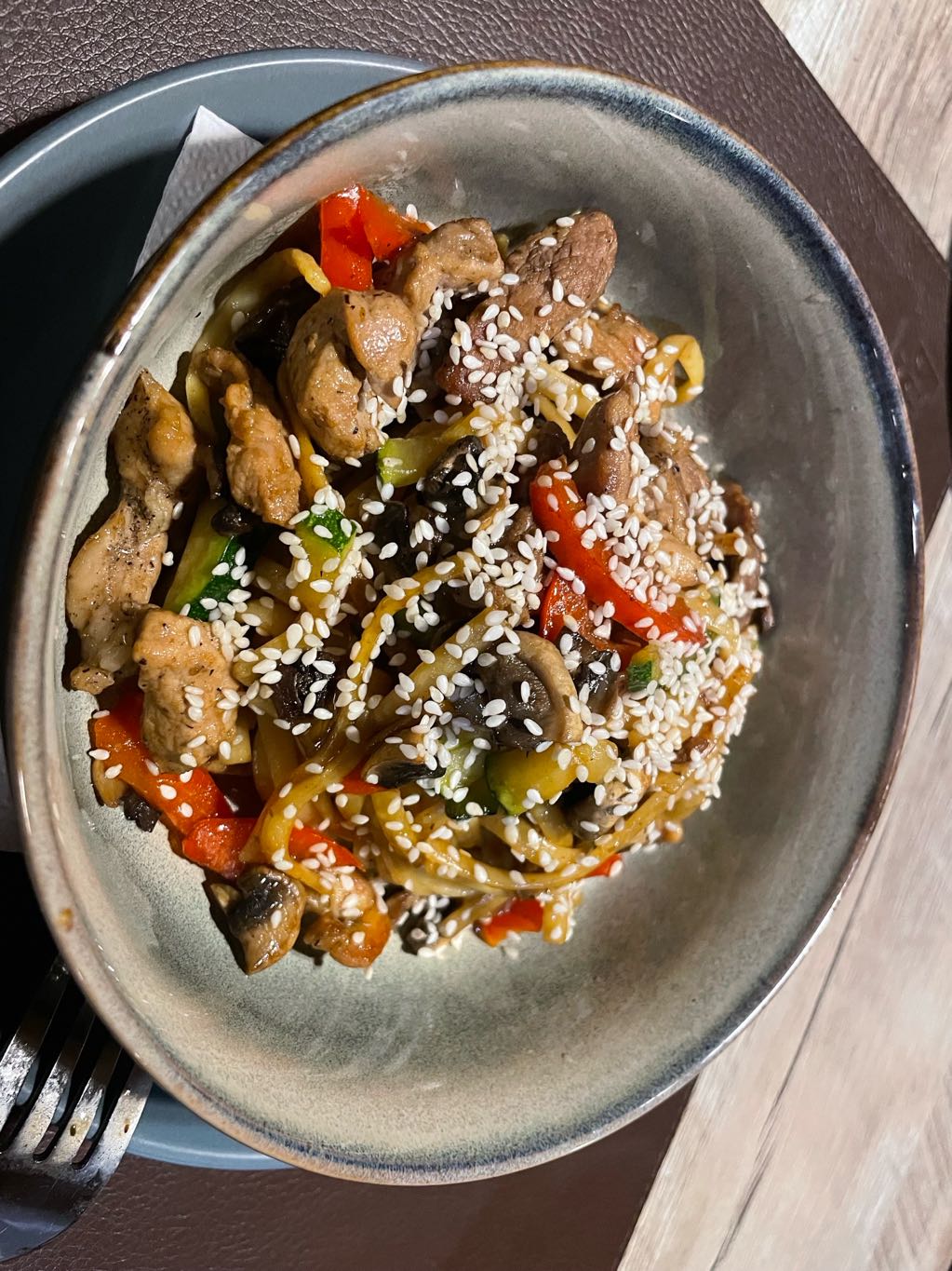 - Куриные бедрышки под сырным соусом с домашней лапшой (фетучини): бедра куриные, сливки, сыр дор блю, чеддер, пармезан, феттучини, микрозелень, соус соевый, чеснок, мёд